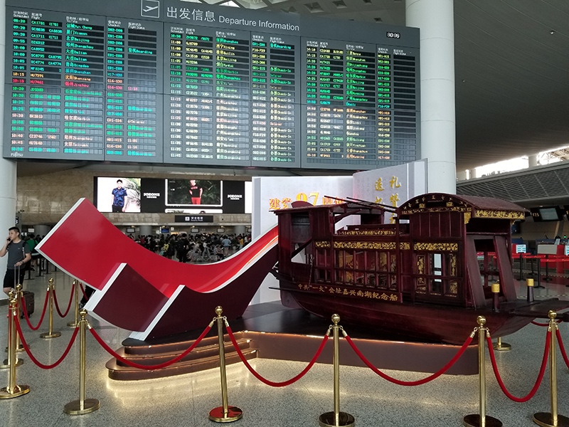2018年7月1日,為紀念建黨97周年,傳承和弘揚紅船精神,航站區中心在T3航站樓出發層11號門對面空地引入“南湖紅船”模型,并對周邊場地進行美化布置,讓過往旅客感受新時代背景下“干在實處、走在前列、勇立潮頭”的浙江精神,深刻體會紅船精神的偉大意義,為航站樓積極營造文化氛圍添上濃厚的一筆“中國紅”,吸引旅客紛紛拍照留念。