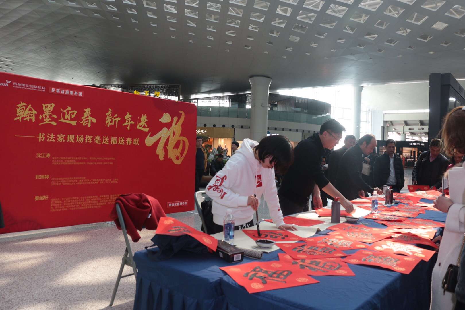 “翰墨迎春送福字”活動。1月23日上午,邀請書法家在T3隔離區內為旅客現場潑墨送福、送春聯?;顒蝇F場,一副副紅色的書法作品引來現場旅客的駐足欣賞,為回鄉的行囊增添一份傳統的“中國禮”,讓新春的航站樓更添了一份喜慶的氛圍。
