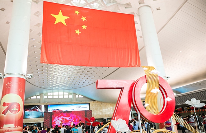 為慶祝新中國成立70周年,9月中旬,在T1、T2、T3航站樓出發(fā)層懸掛巨幅國旗、陳設(shè)國慶景觀布展,吸引了大批出行旅客合影留念,進一步充實樓內(nèi)豐富多彩的國慶節(jié)日氛圍。9月30日上午,航站區(qū)中心聯(lián)合各單位在T3航站樓出發(fā)大廳舉辦以“這一抹中國紅”為主題的國慶文藝匯演。演出現(xiàn)場精心呈現(xiàn)了歌曲演唱、舞蹈表演、樂器演繹等10個表演節(jié)目,激揚的歌聲、優(yōu)美的旋律、動人的舞蹈和有趣的知識問答互動,吸引了旅客駐足觀賞,共同慶祝新中國成立70周年,為祖國的繁榮昌盛送上最真摯的祝福。