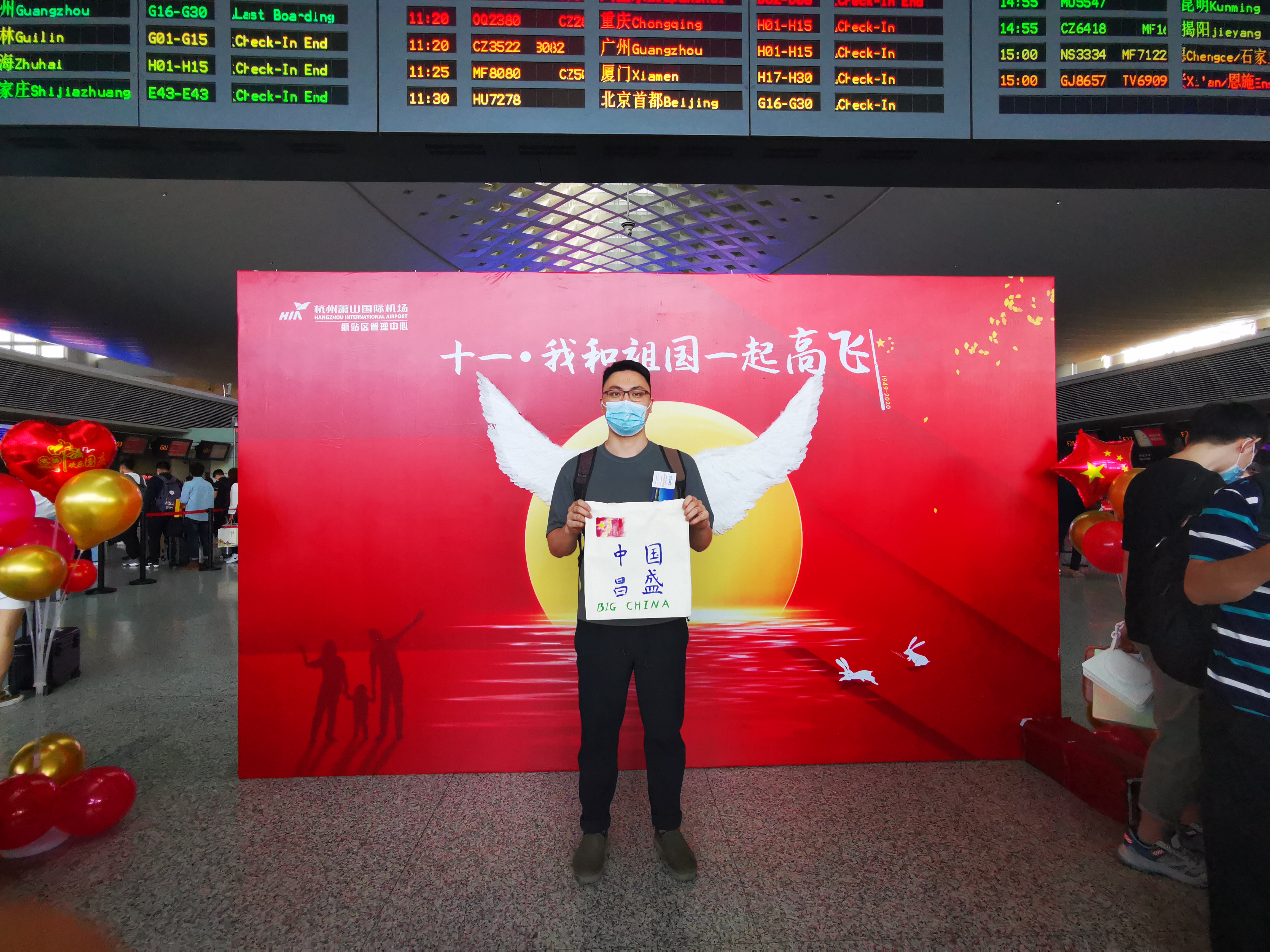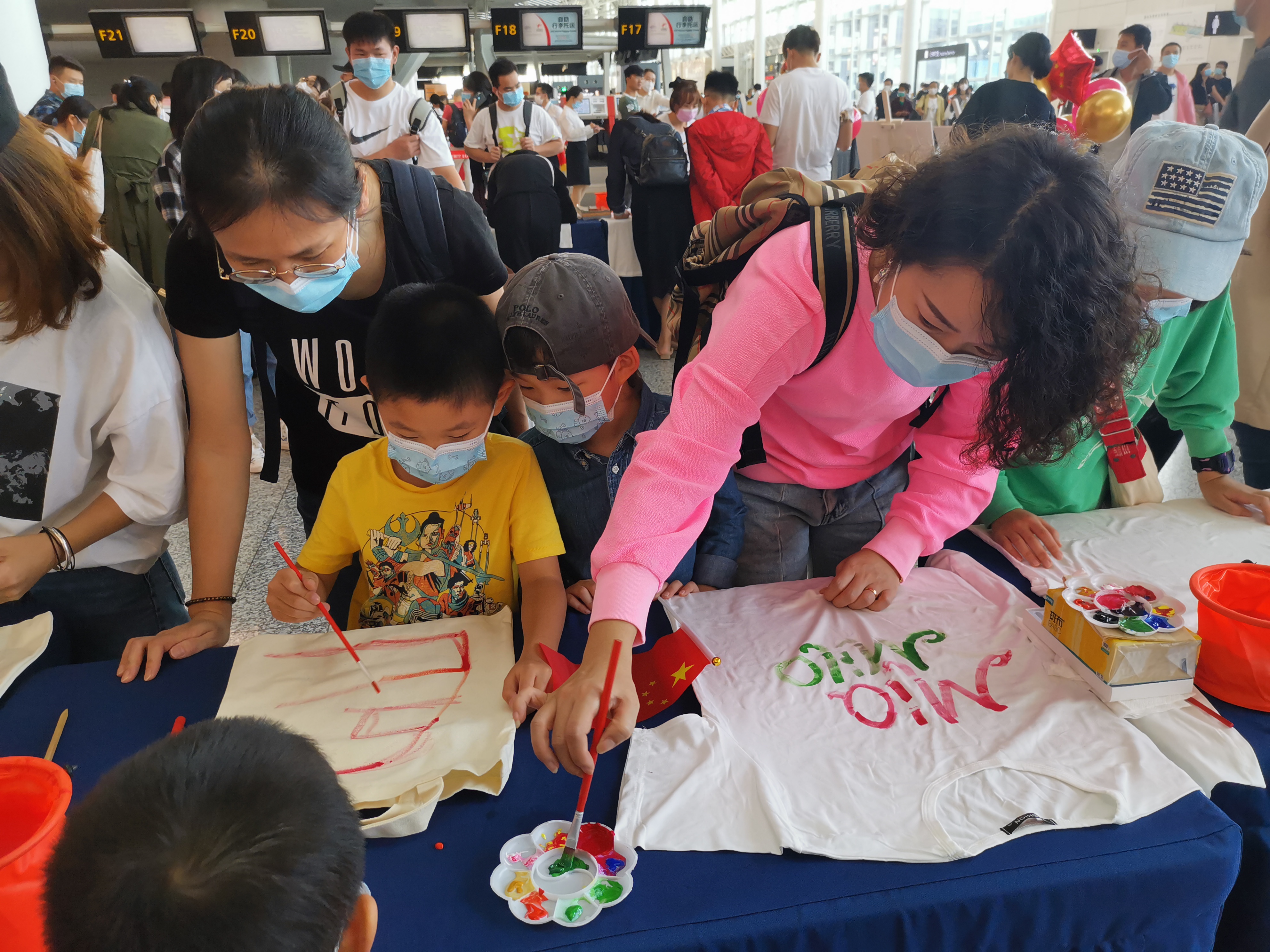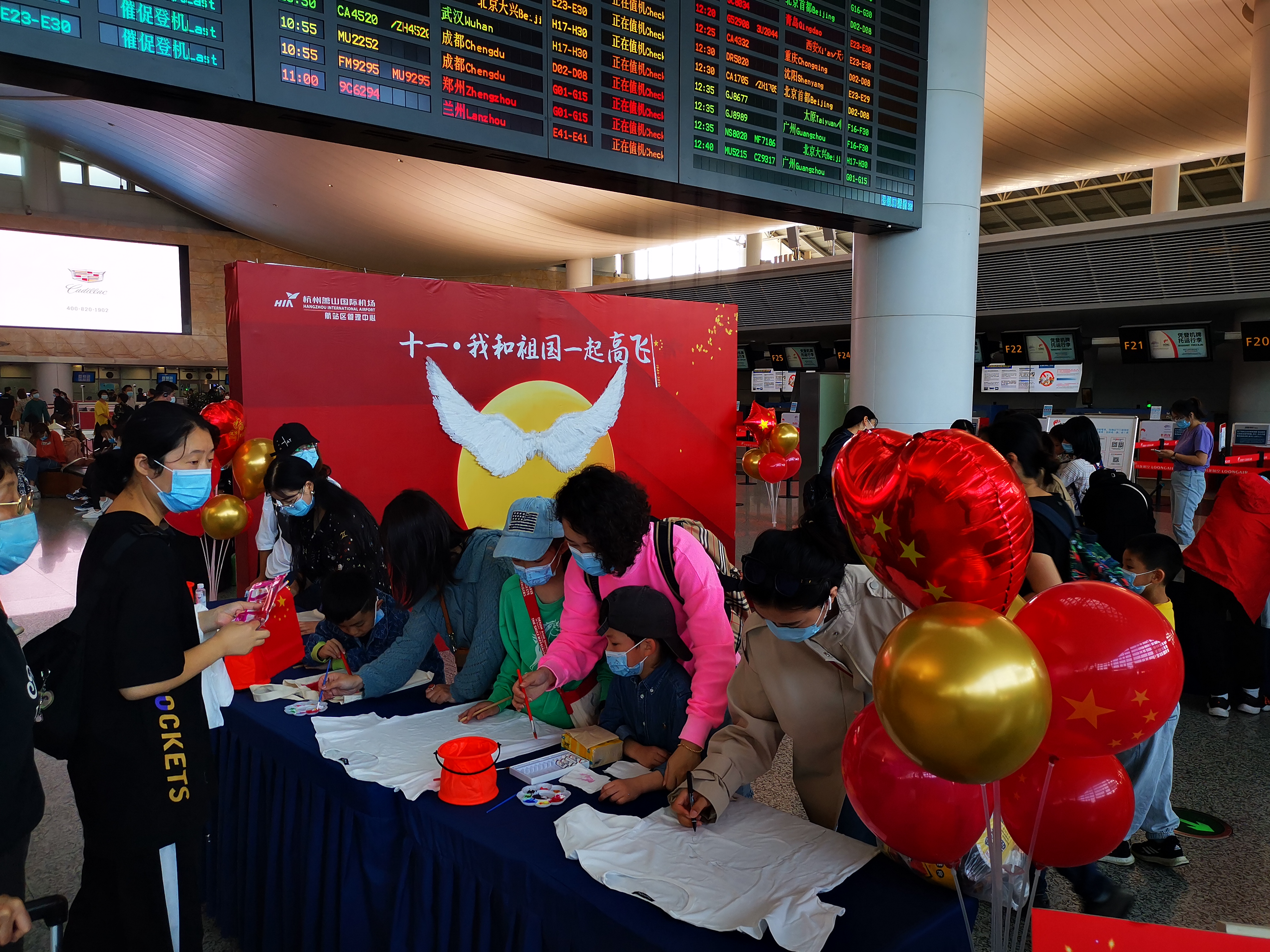 10月1日,在T3航站樓內開展“十一,我和祖國一起高飛”旅客互動活動。現場一對長2米的立體翅膀成了當天現場旅客爭相打卡的網紅拍照點,同時旅客們在一件件依次擺放的T恤衫和帆布袋上,用顏料DIY彩繪出雙節的美好祝愿,制作了一份專屬于旅客和機場的雙節記憶。