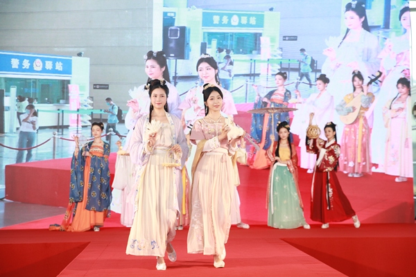 活動現場,8名身著傳統漢服的演員在長10米的T臺上表演,并為旅客分發國慶定制版口罩和小國旗。在古箏、笛子、二胡、琵琶的合奏下,旅客揮舞小國旗,共同慶祝偉大祖國72周歲華誕。此次活動以漢服秀、 國樂演奏等形式,展現出中華傳統文化的獨特魅力,也為今年5場“初心”系列文化活動畫上了圓滿句號。