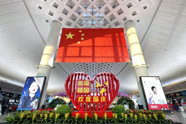 為營造國慶節日氣氛,航站區中心在T3航站樓懸掛一面長9米、寬6米的定制版大國旗,在T3值機島指示牌下懸掛2號國旗,吸引旅客駐足拍照留念。此外,航站區中心在航站樓5號門、9號門、11號門、G值機島、國內旅客到達出口等6個區域,用綠化景觀打造節慶布展,讓旅客感受濃濃的國慶氛圍,傳遞和弘揚愛國主義精神。(李俊杰 張璐瑤 文 馮祺 攝)