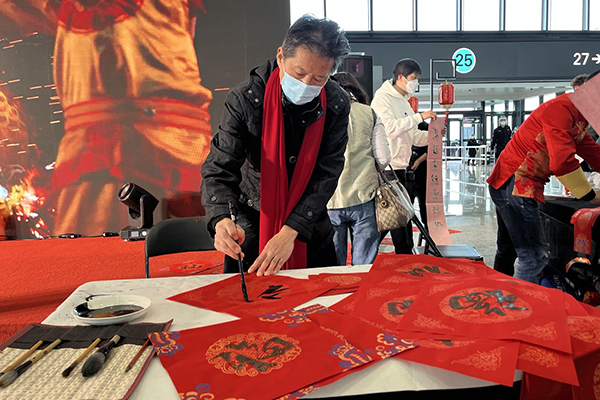 春節(jié)將至,1月11日,杭州機(jī)場開展“辭舊迎新 大展宏‘兔’”新春文化活動(dòng),邀請(qǐng)書法名家現(xiàn)場揮毫潑墨,為旅客寫春聯(lián)、送福字,營造濃厚過節(jié)氣氛,送上新春美好祝福。