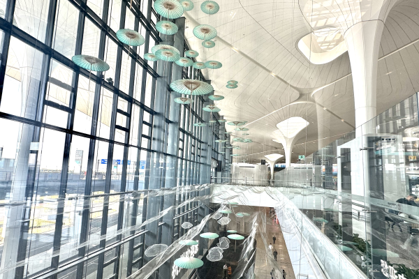 與傳統(tǒng)大型空間藝術(shù)展陳裝置不同的是,“煙雨江南”裝置不僅彰顯了地域文化風(fēng)采,同時還具備空防安全的效用。自T4投運以來,25號門兩側(cè)、T4國內(nèi)行李提取通道上空,因空間屬性特殊,存在一定的安全隱患。在民航浙江監(jiān)管局空防處多次現(xiàn)場調(diào)研和寶貴建議下,航站區(qū)中心立足區(qū)域管理中心職責(zé),主動作為、立題設(shè)項,組織多場內(nèi)部研討,提出了建造兼具安全、美觀功能性裝置的破題思路,在管控空防安全隱患、減少安保人員配置的同時,持續(xù)賦能T4文化屬性。