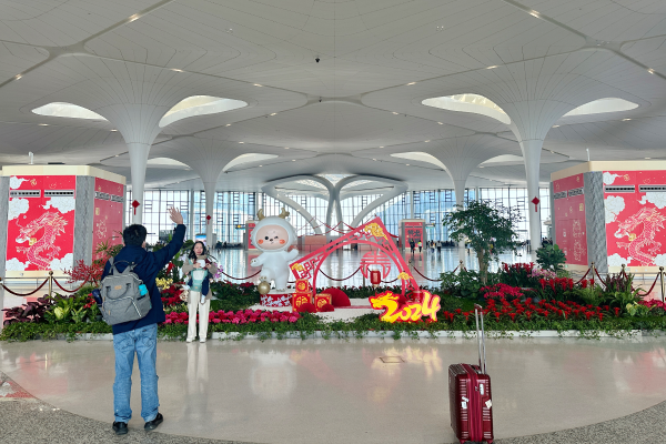 為迎接新春佳節(jié),營造喜慶祥和的節(jié)日氛圍,T4主景花堆換上了“年味”十足的新衣。新年花堆的中央位置設(shè)置拱門格柵,并采用中國傳統(tǒng)新年元素紙扇、金福禮盒、鞭炮等組合作堆頭裝飾,搭配仙客來、紅心、杜鵑、一品紅等紅色時花進行圍繞,立體擬人龍年龍寶寶卡通形象站立其中,俏皮可愛,令出發(fā)大廳煥然一新,洋溢著團圓、吉祥、美好,營造出喜慶的節(jié)日氛圍。