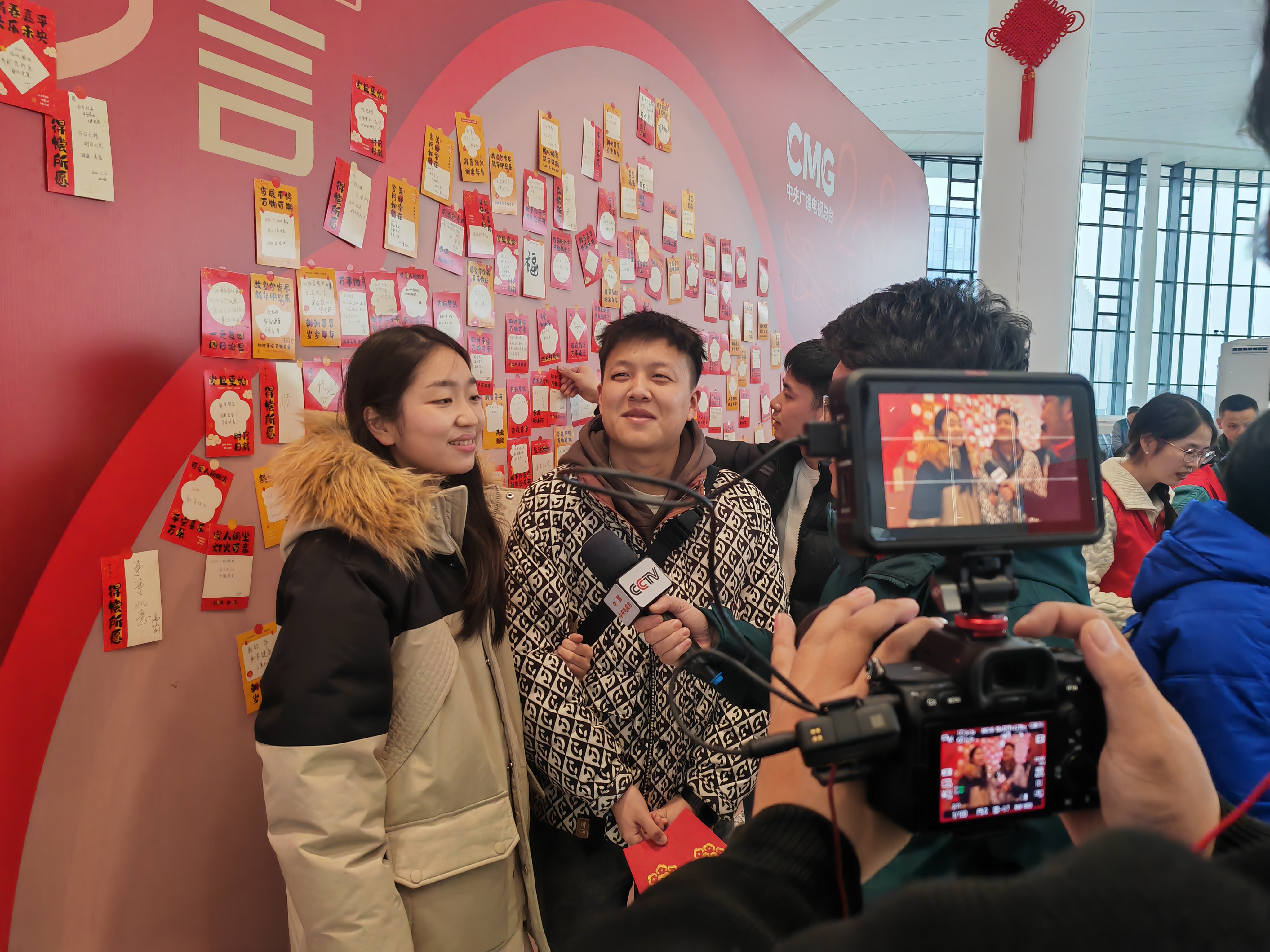活動現場設立了一面長7米,高3米的巨幕墻,為旅客提供心愿賀卡和貼紙,吸引過往旅客紛紛寫下新年祝福留言,形成一面“心愿墻”。一位小男孩在心愿賀卡工整地寫下“祝爸爸媽媽爺爺奶奶身體健康”,許多旅客寫下“新年快樂”“國泰民安”“暴富!財運來”等樸素愿望。來自潮汕的七口之家面對央視鏡頭,用潮汕話祝全國各族人民龍年行大運。大家紛紛用最真摯的語言和文字, 祈福祖國,祈愿新年。