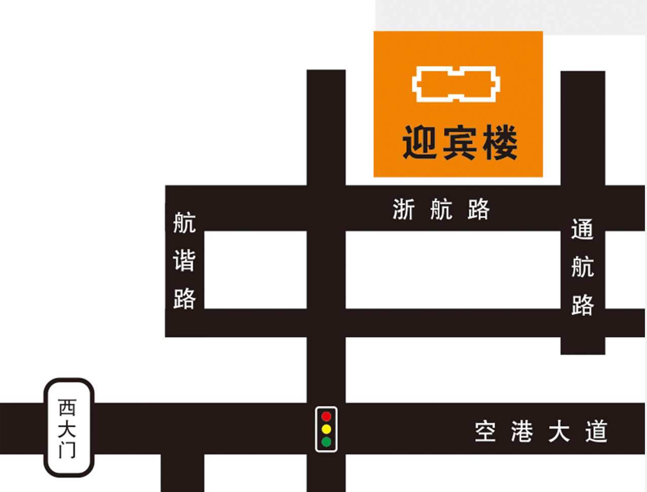 進機場西大門后在第一個紅綠燈左轉上航安路,在第二個路口右轉上浙航路,迎賓樓位于左側
