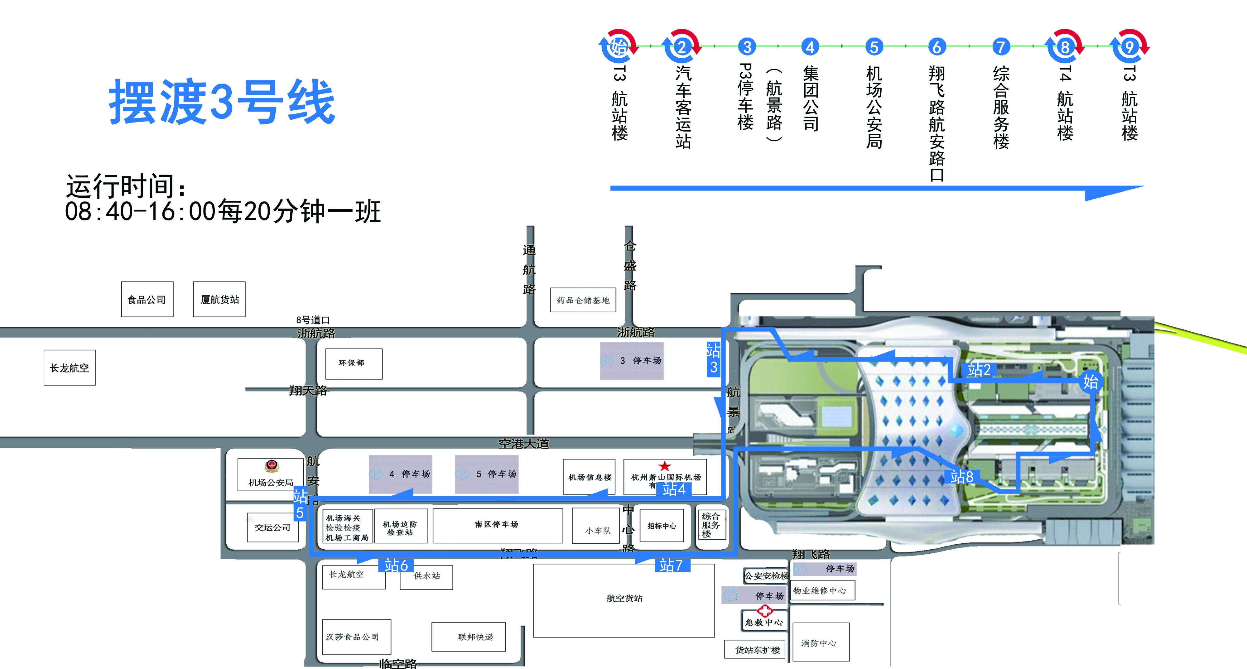 T3航站樓→汽車客運站→P3停車樓→集團行政樓→機場公安局→翔飛路航安路口→綜合服務樓→T4航站樓→T3航站樓。