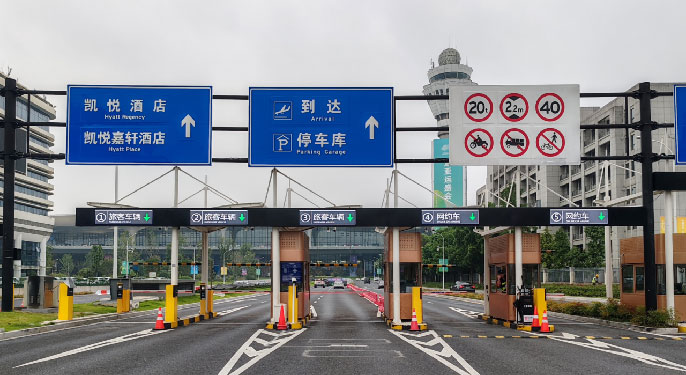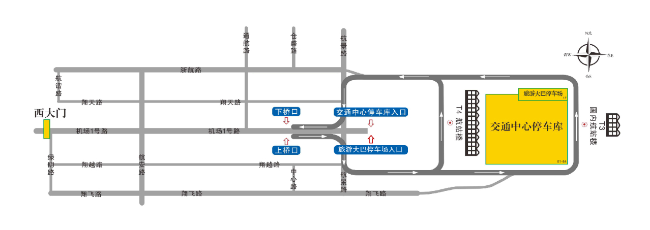 交通中心停車庫(近端):該停車庫位于交通中心B1-B4層??裳貦C場1號路左側地面道路直行進入。